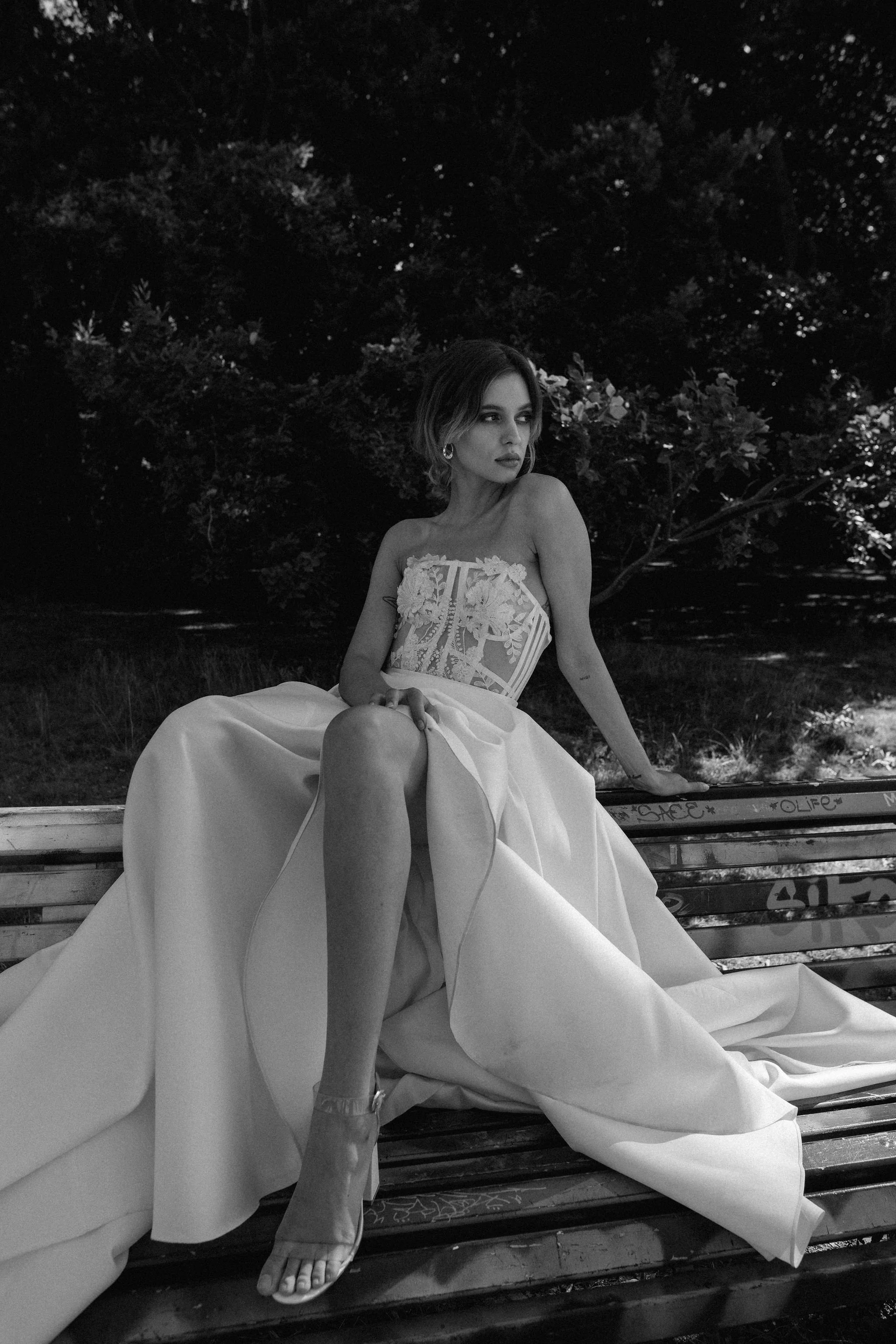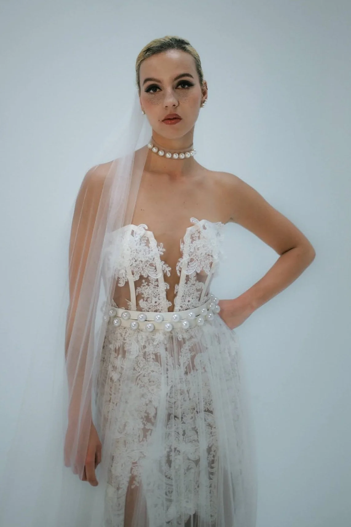 Discover our avant-garde ivory two-piece—a bold reinterpretation of wedding couture. The transparent corset top is expertly crafted from illusion tulle with visible boning, lace-up sides, and delicate beaded lace appliqués, accented by a pointed detail in the front. Complementing this is a floor-length taffeta skirt featuring side slits and oversized statement bows on the hips, creating a deconstructed, fashion-forward look perfect for the modern bride or trendsetting fashionista.
