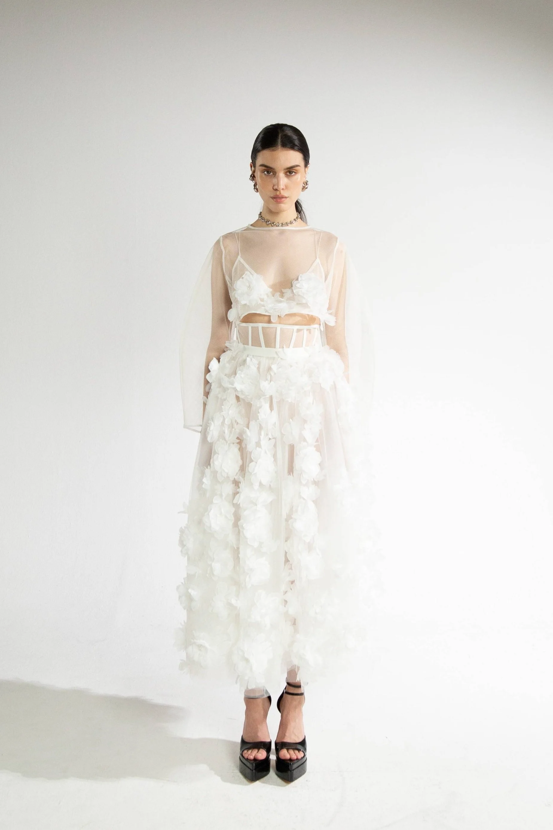 The collection presents itself boldly and daringly in various aspects. It captures attention with large, handcrafted organza blossoms, pearl-embroidered 3-D lace, and opulent feather embroidery. The wide range of styles, cuts, and combination possibilities reflects the individuality of the wearers, a principle that has been fundamental at Ritual Unions from the outset. Each dress for this special occasion is designed to accentuate the wearer's unique personality.